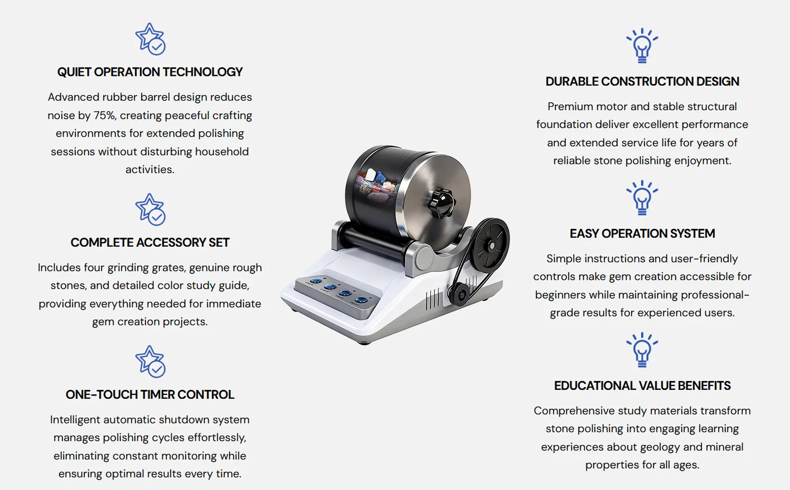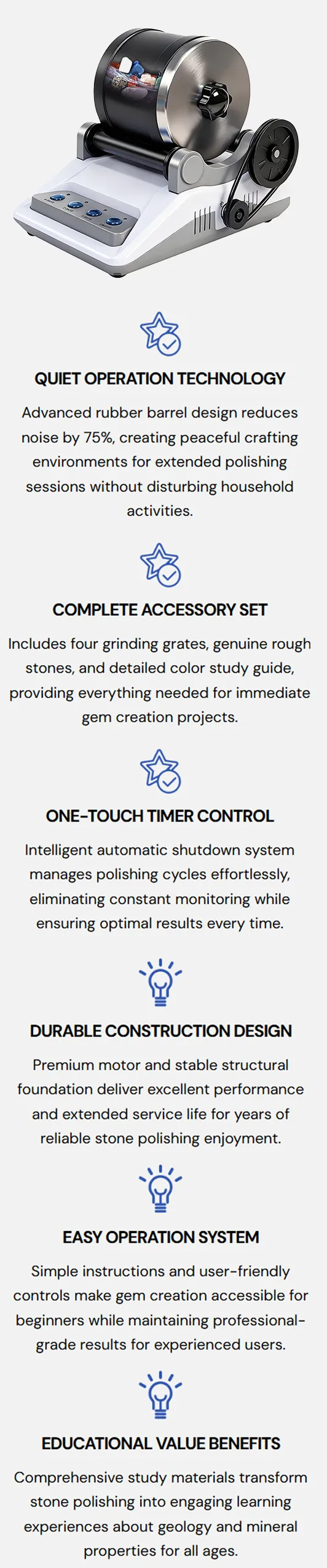 - Enduring Value: The tumbler itself is durable and easy to operate, and it continuously rewards the user by transforming ordinary rough stones into dazzling gems, providing ongoing achievement and discovery.